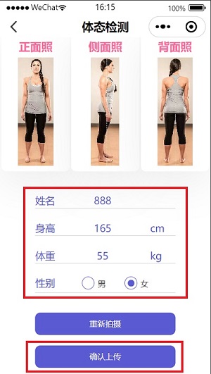 d. 拍照完成后,出现预览图,对照参考图片(视角及只要身体部位是否完整)决定是否重拍,填写基础信息,后点击提交。